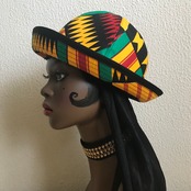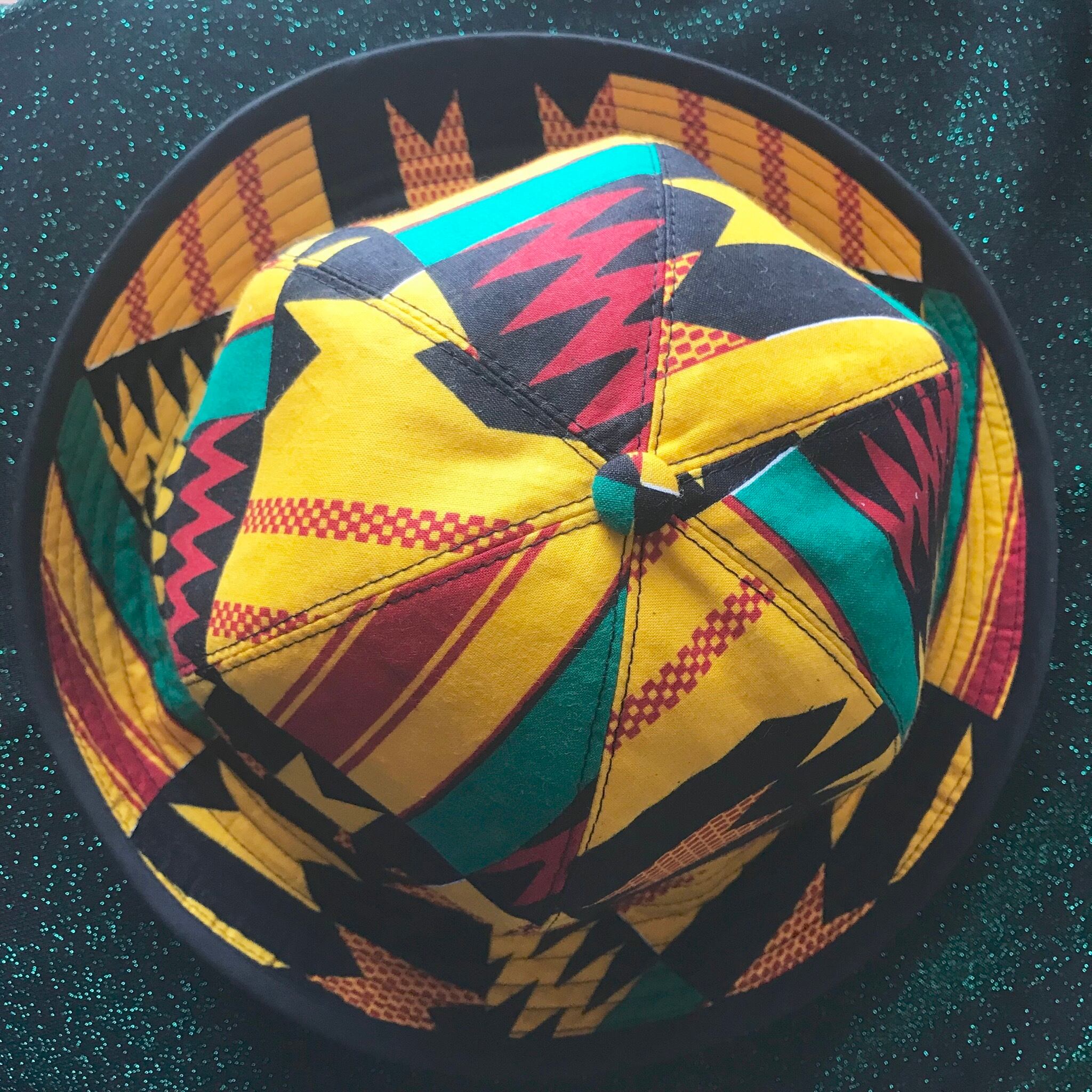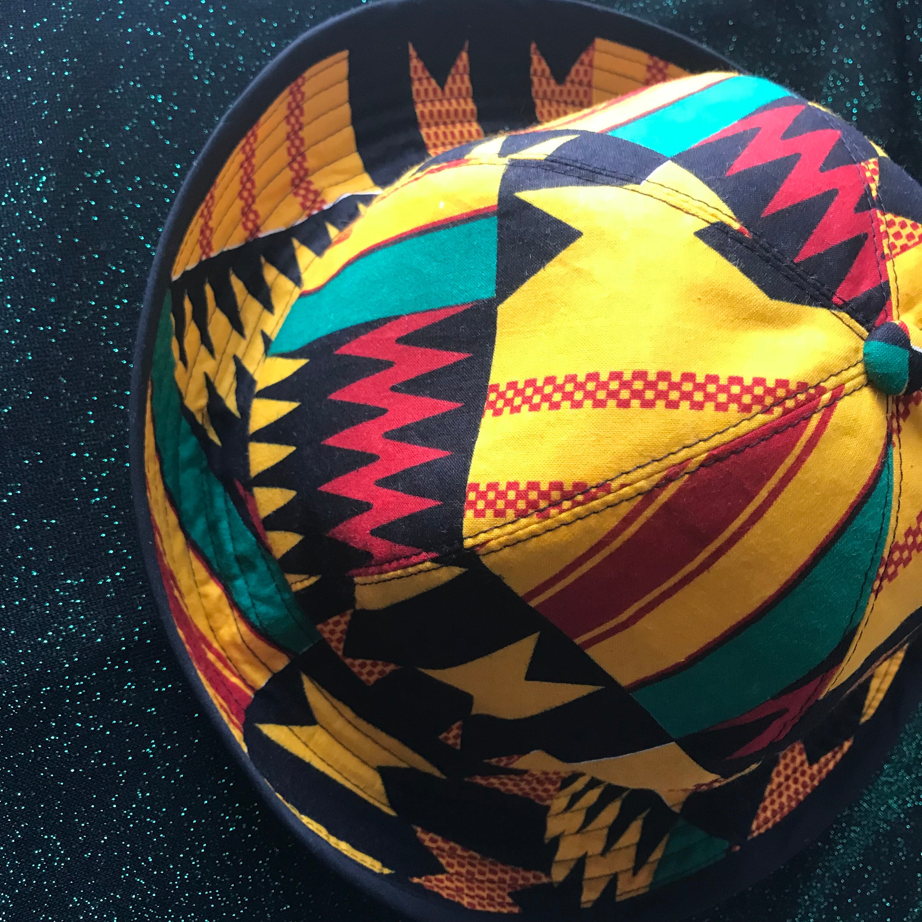 イエローベースの生地にバーガンディ、グリーン、ブラック。