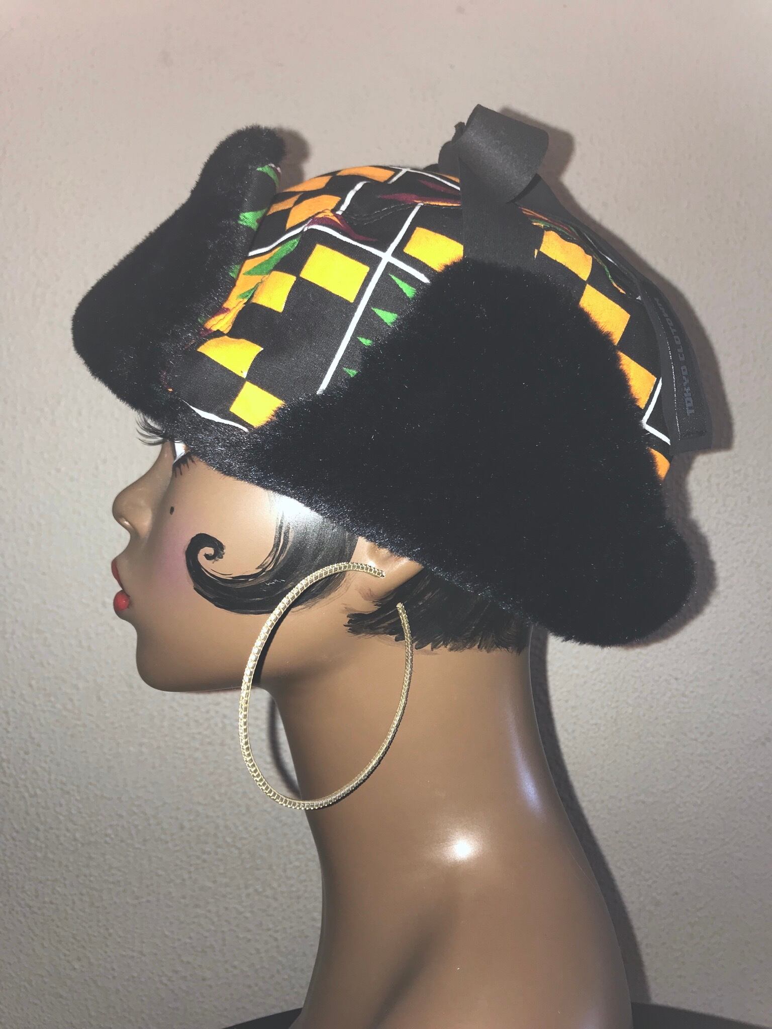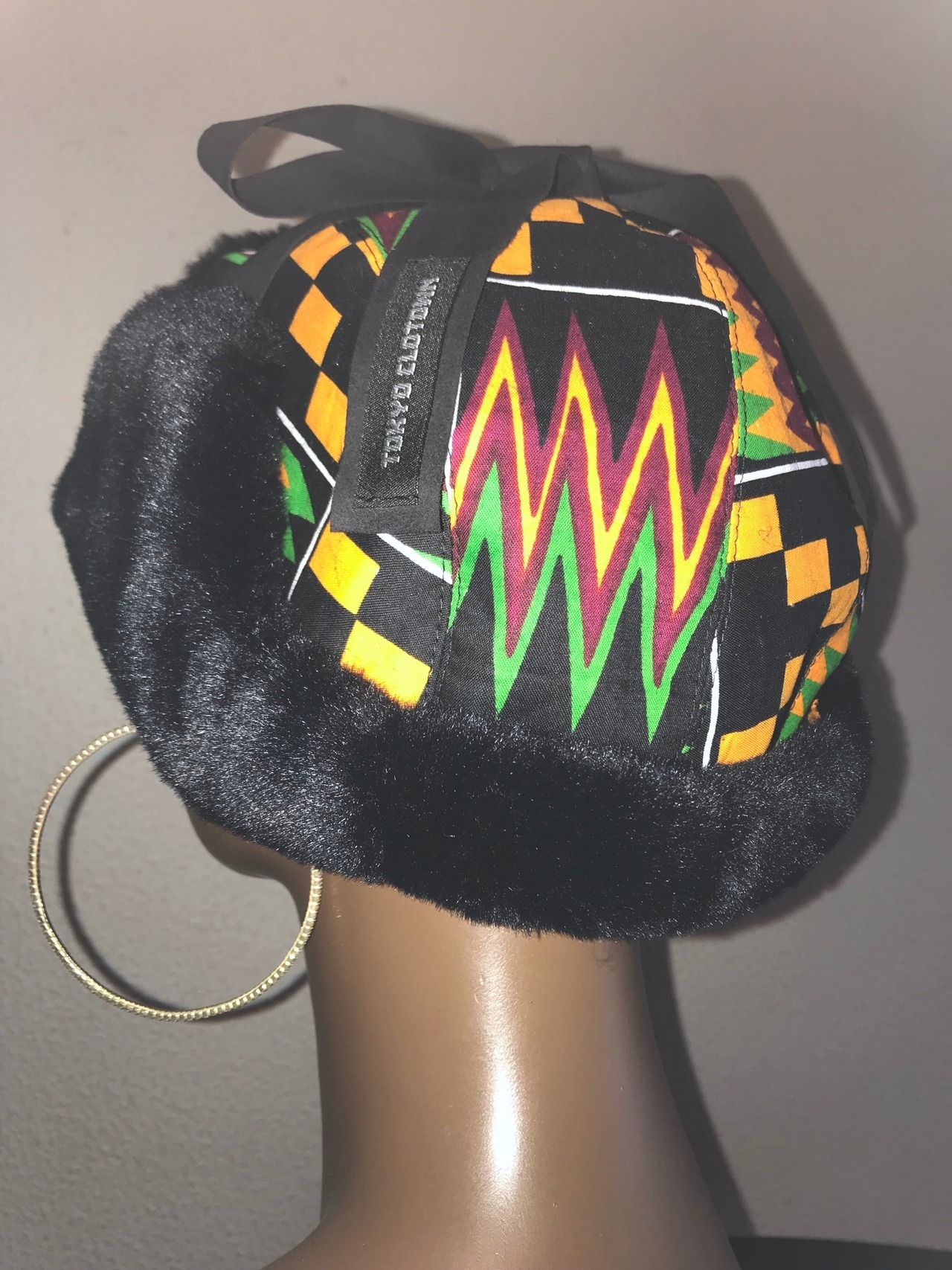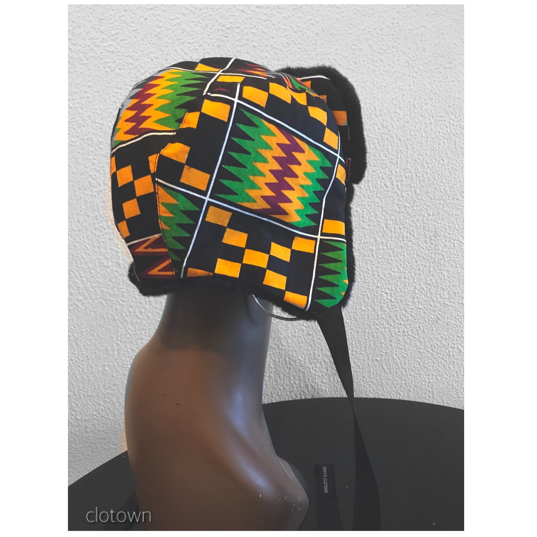 アフリカンプリントと、ブラウンの無地のファーを組み合わせたフライトキャップ。