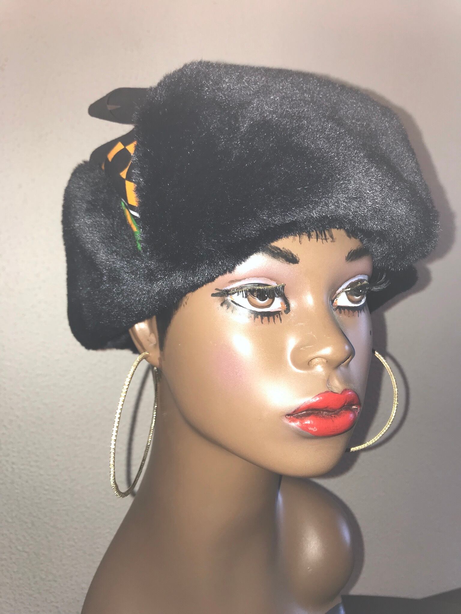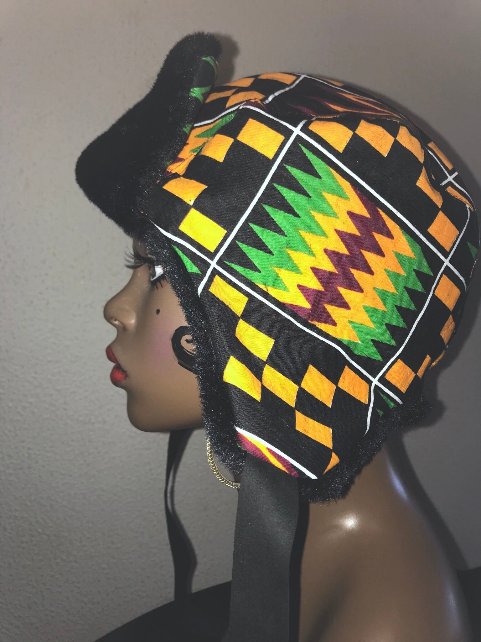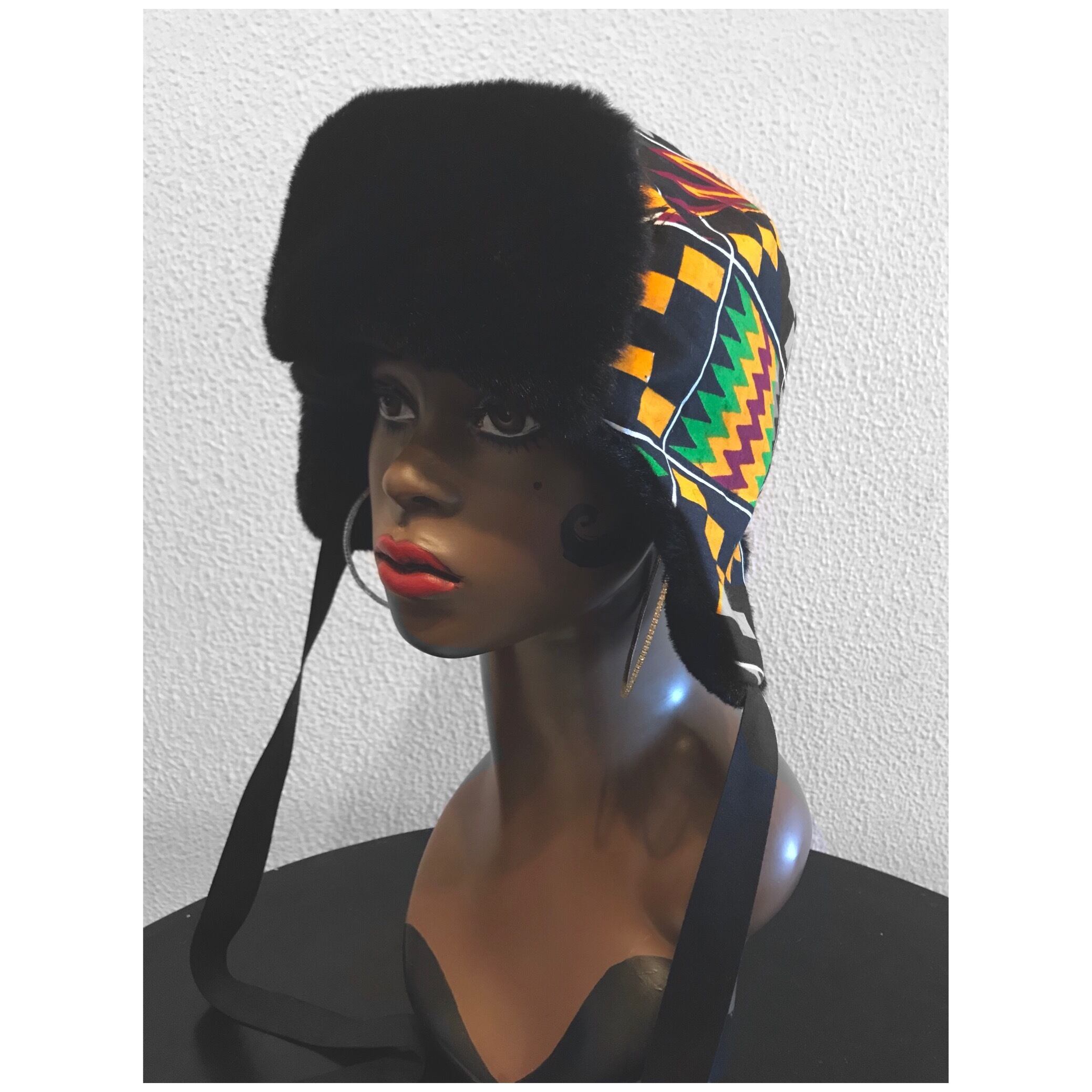 アフリカンプリントと、ブラウンの無地のファーを組み合わせたフライトキャップ。