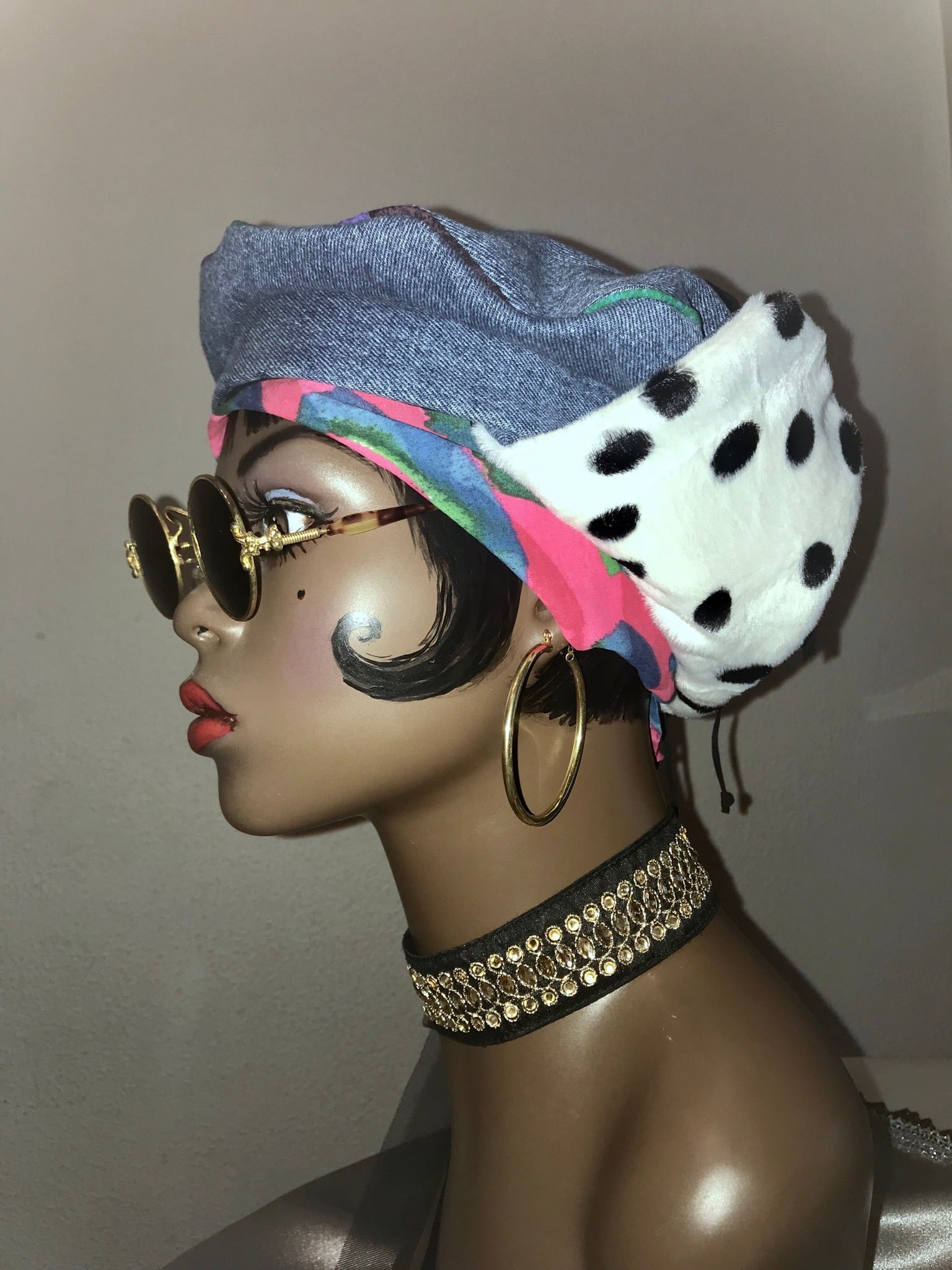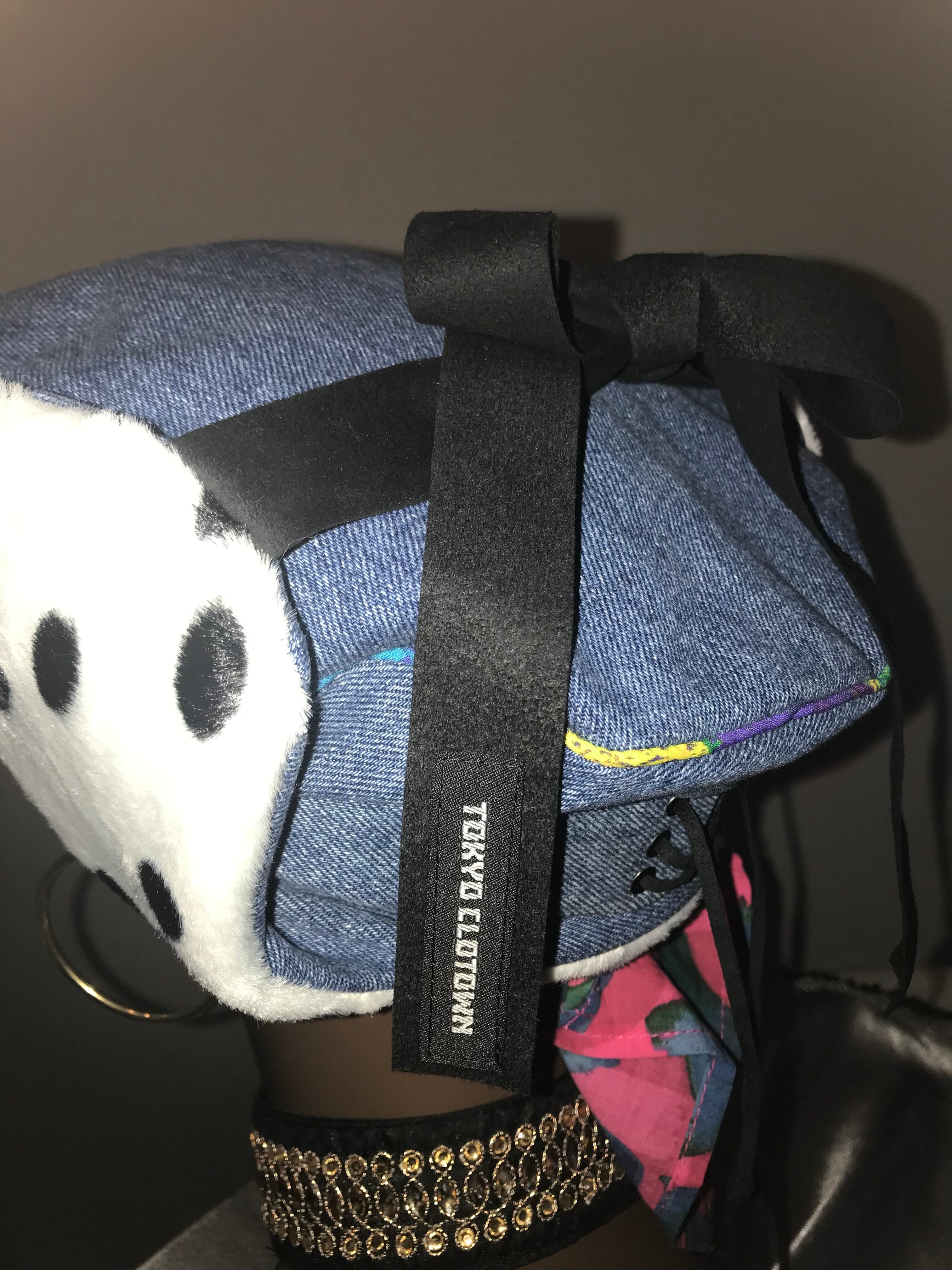 耳当てが厚みがある為、ベレーだけの時は後ろの紐を生地同士が重なる感じにしてサイズを小さくします。耳当てを付けた時はきつくなるので、後ろを開き気味にして調整。