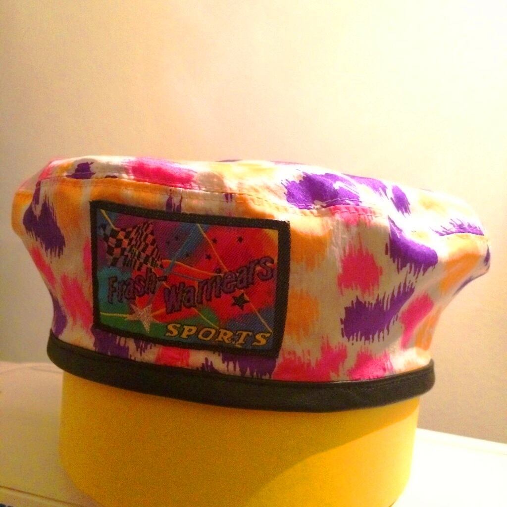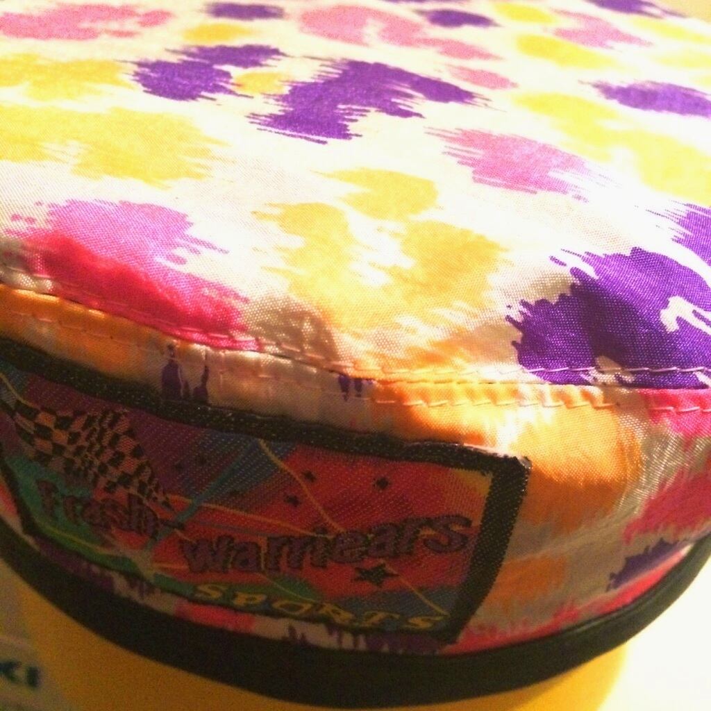 片面はさらっとしたナイロン素材に鮮やかなピンク、紫、オレンジのプリントが入っています。