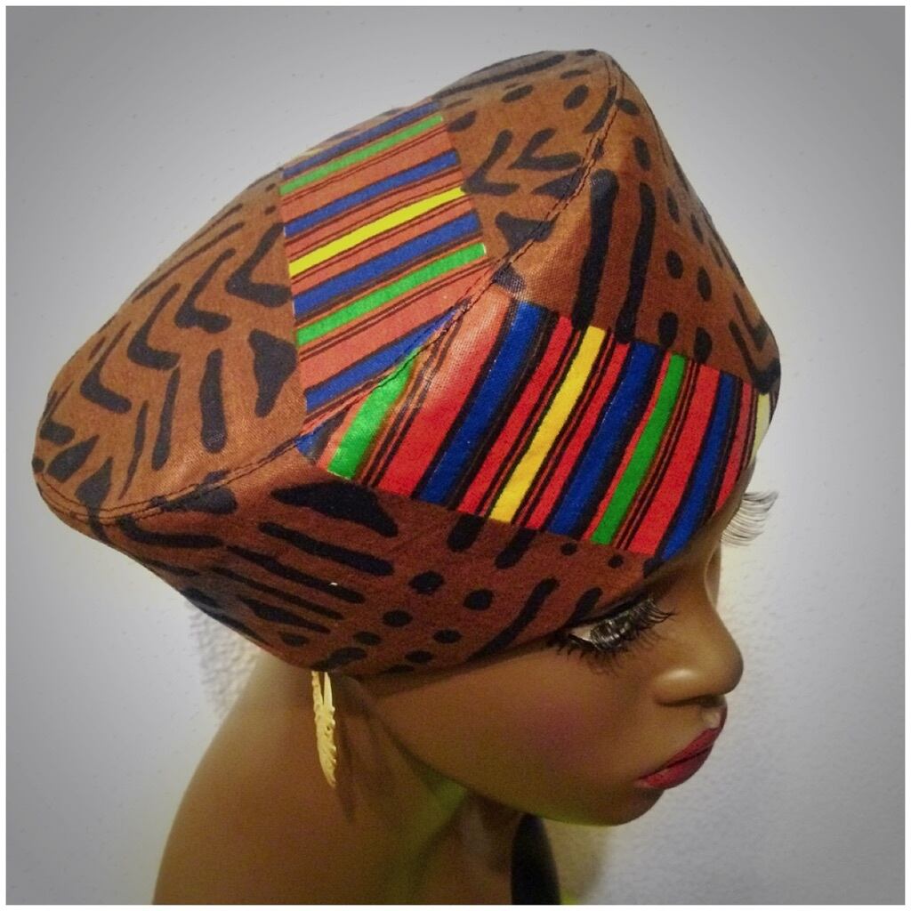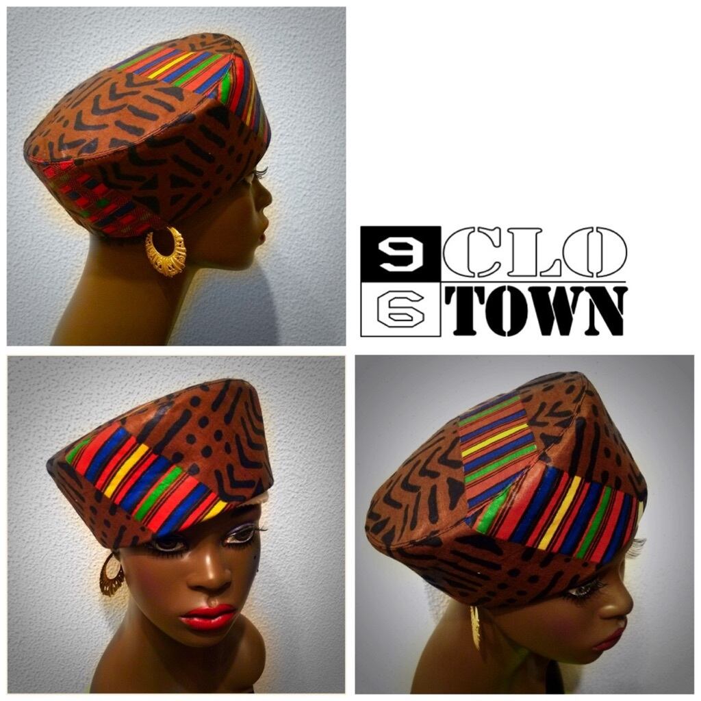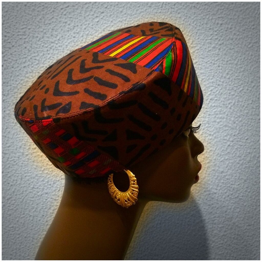 上の向かって少し広がってるシルエットのアフリカンハット。 形を整えてかぶると角がでますが、