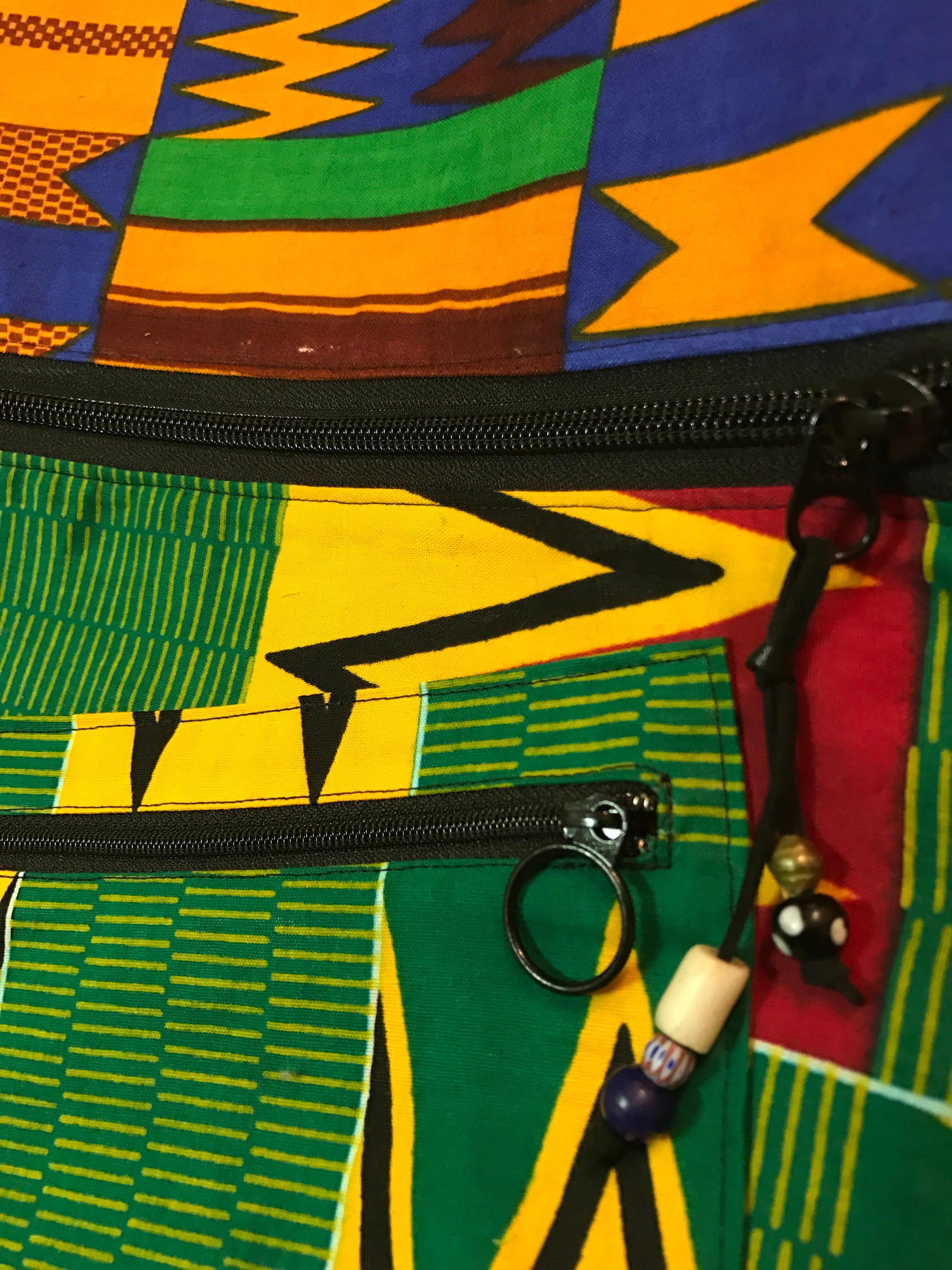 外側のZIPにレザー紐とアフリカンビーズのチャーム付。