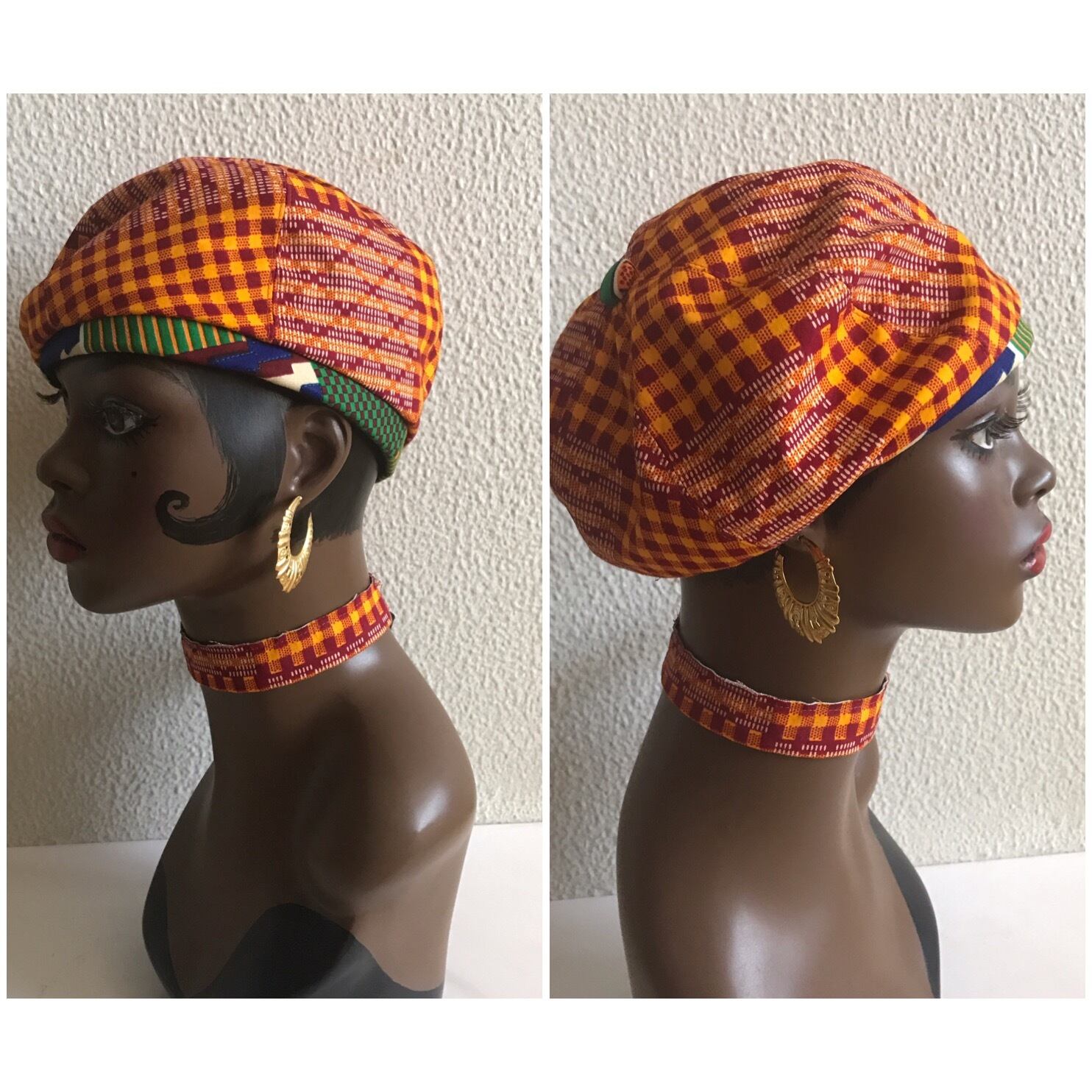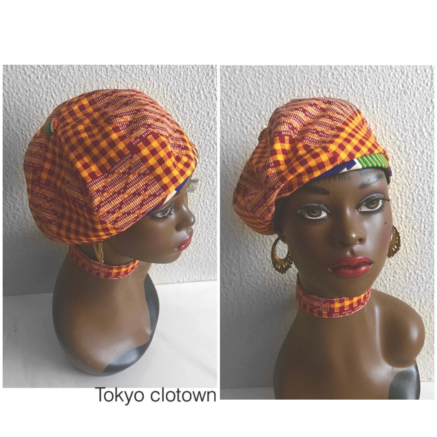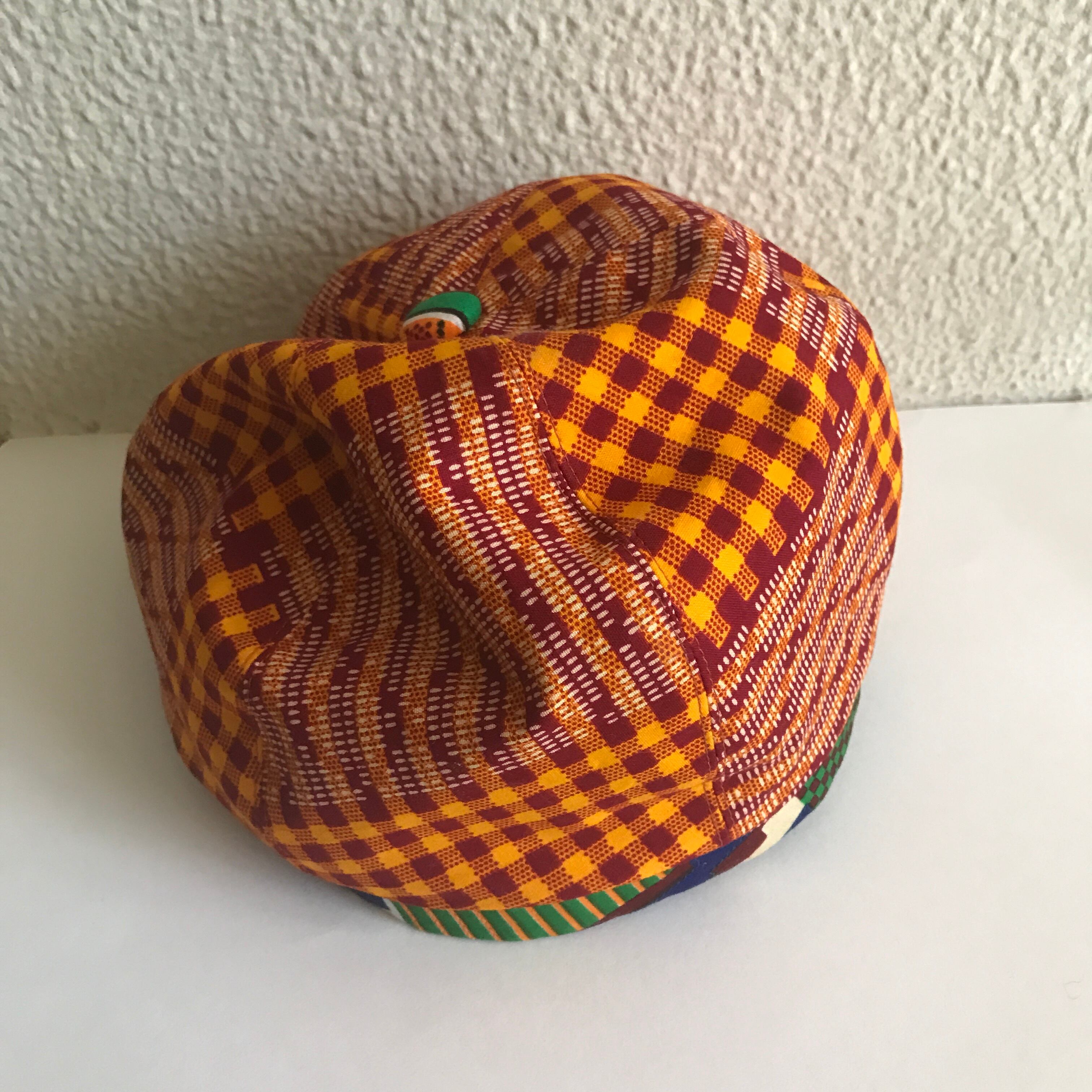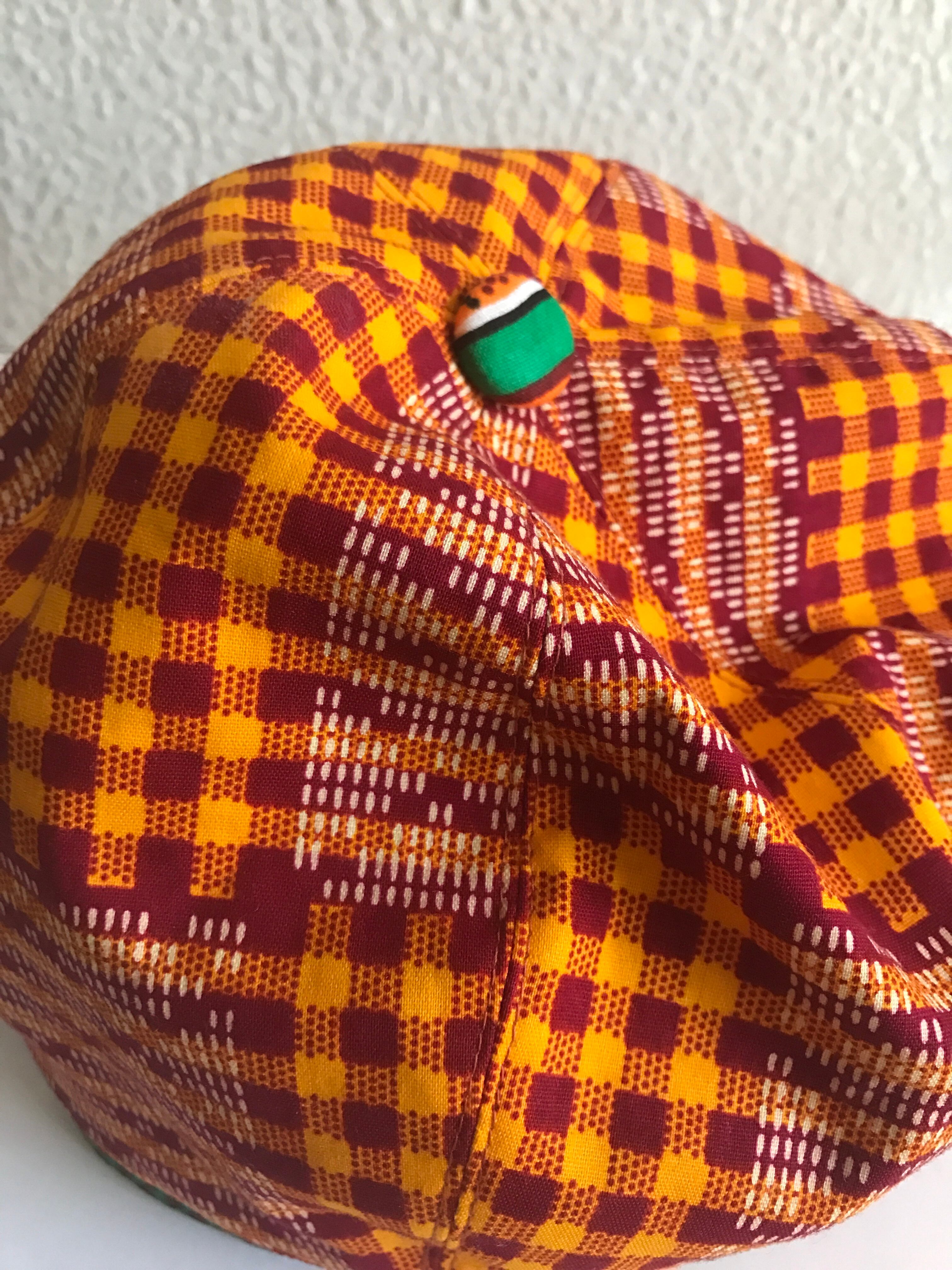ガーナとシエラレオネからの生地で作ったベレー帽。ボリュームが出るタイプではなく、こじんまりとしたシルエットです。