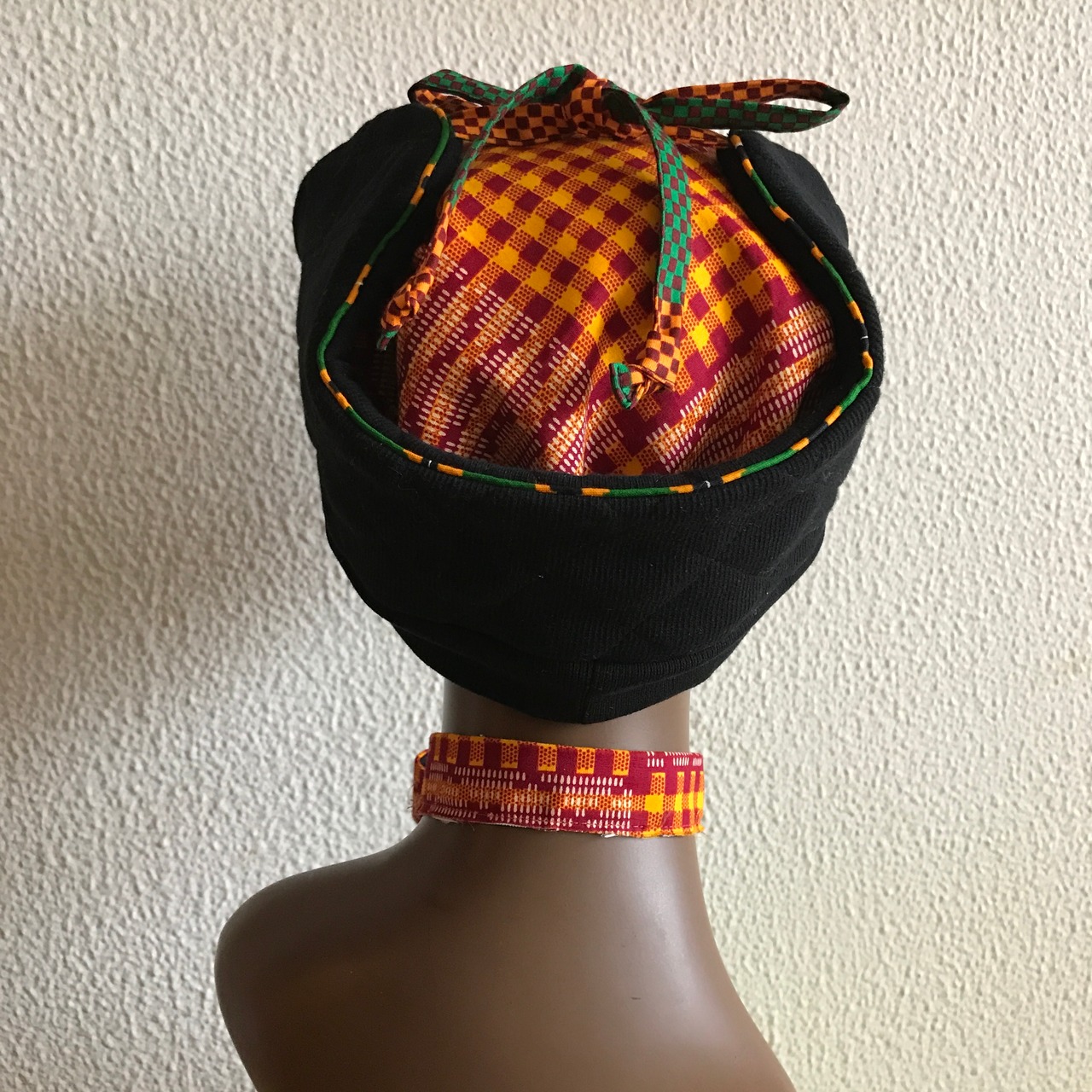 黒いリブはストレッチなので程よくフィットします。頭囲56程度 Mサイズをベースに作ってありますので、極端に頭囲が小さい方、大きい方には不向きです。