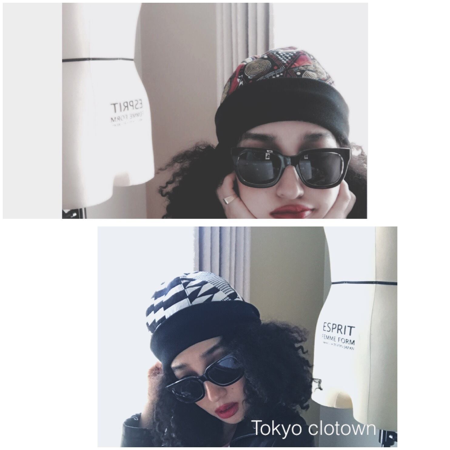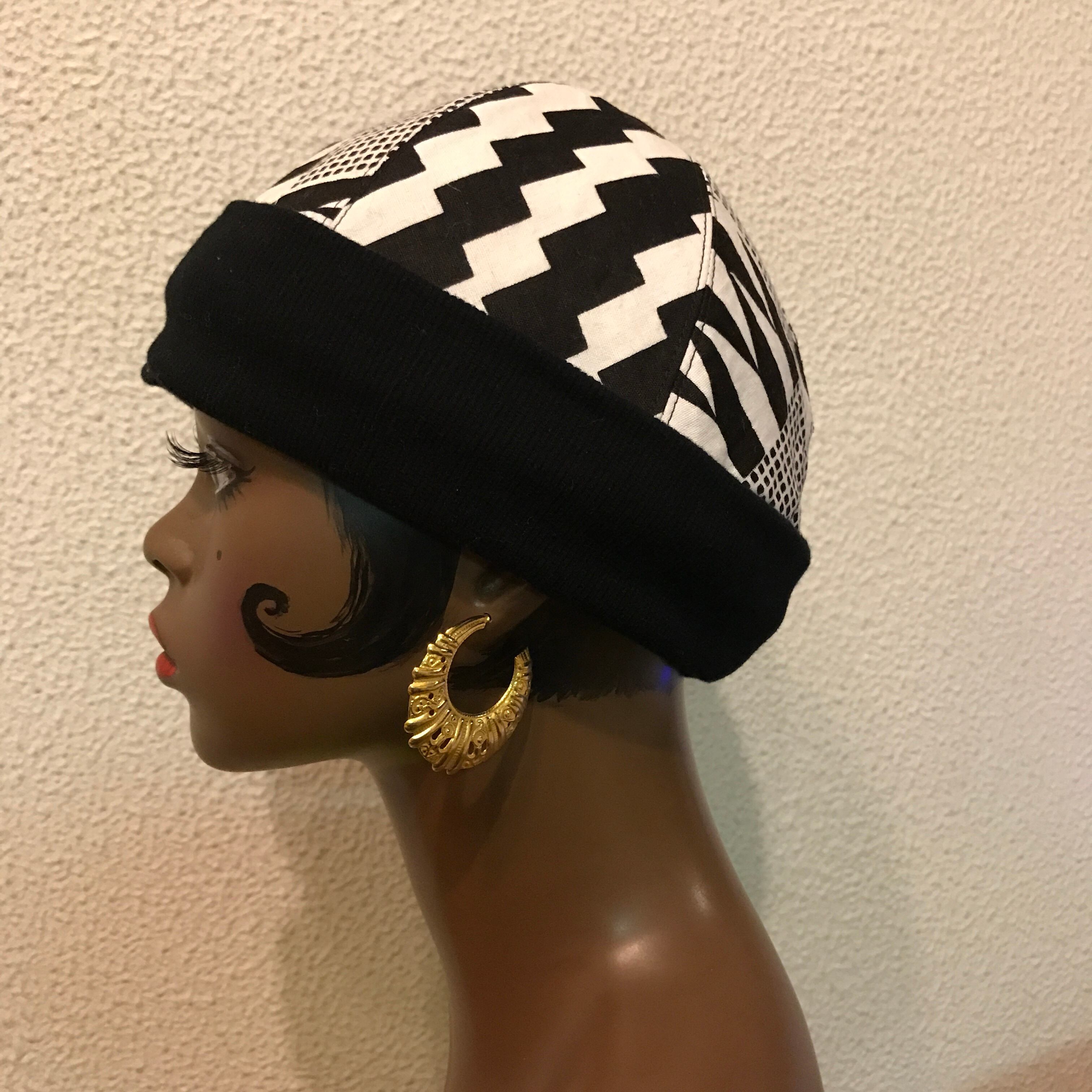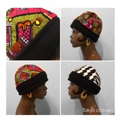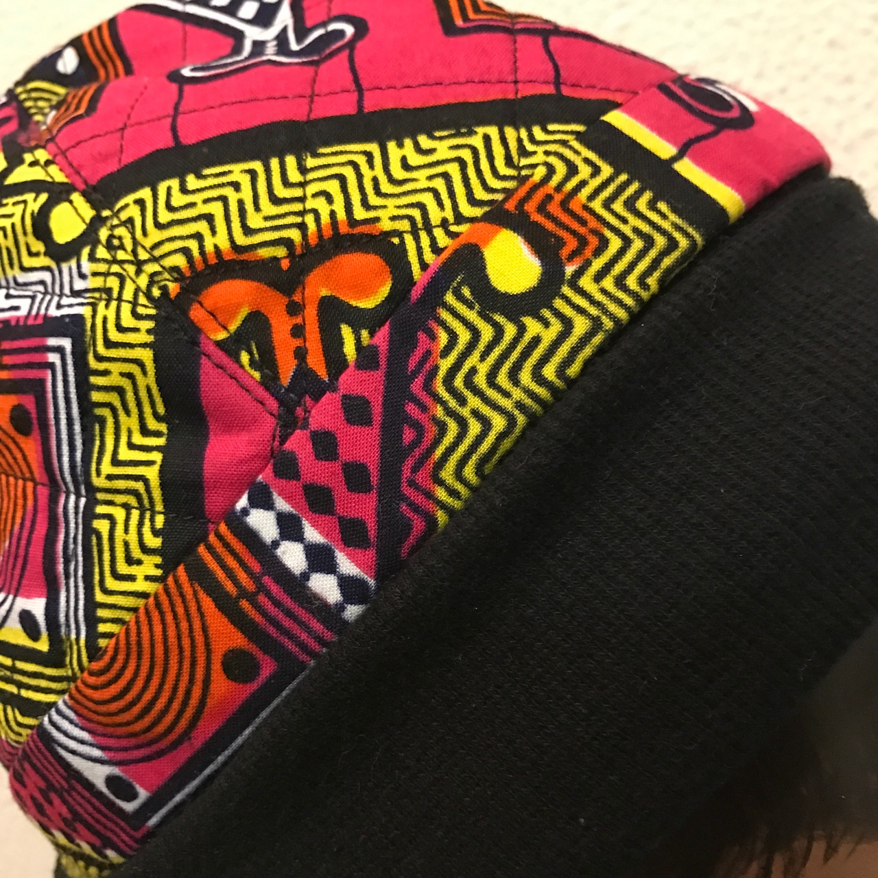 表はピンクアフリカンプリント、中綿をいれてキルティングにしてあります。幅広リブがヘッドバンドしている風にも見えてレトロな雰囲気です。