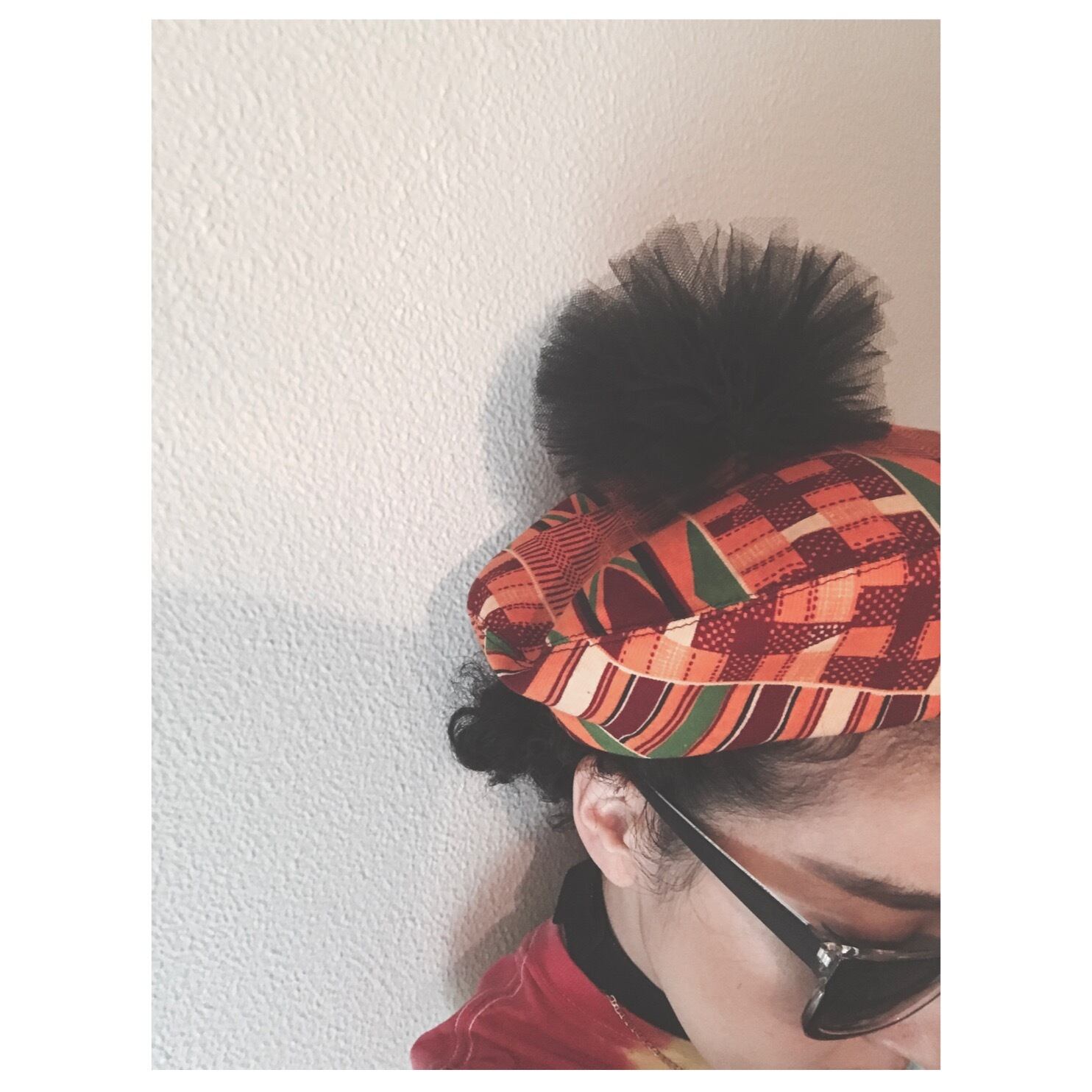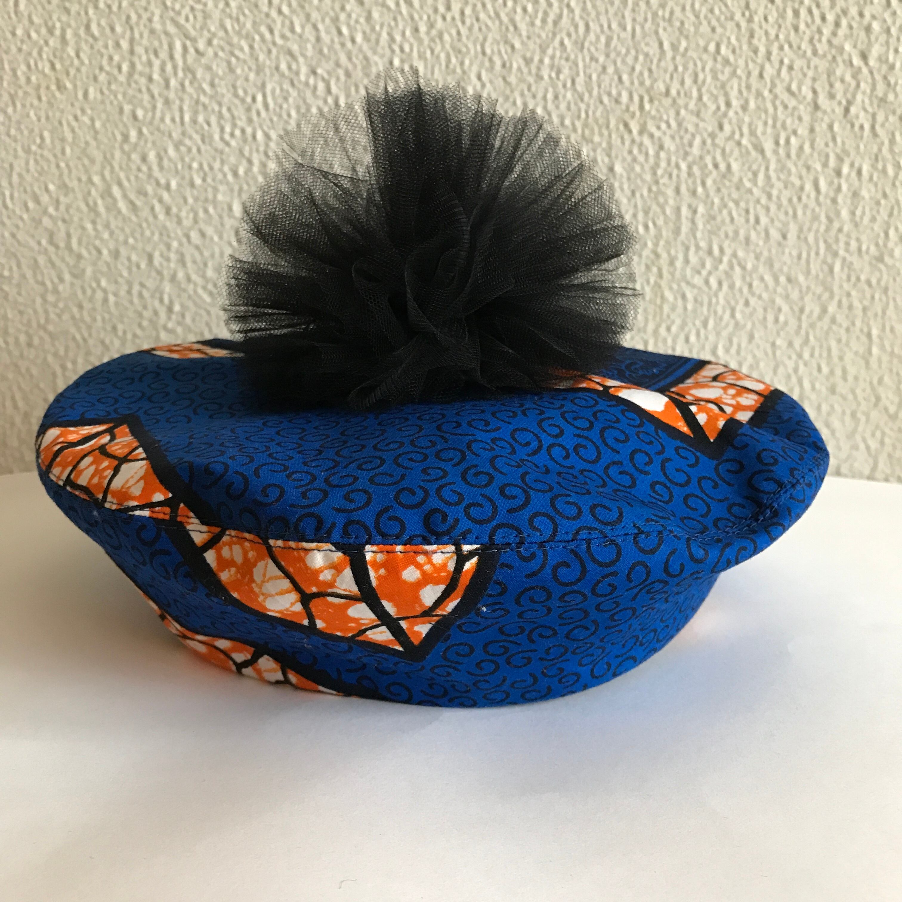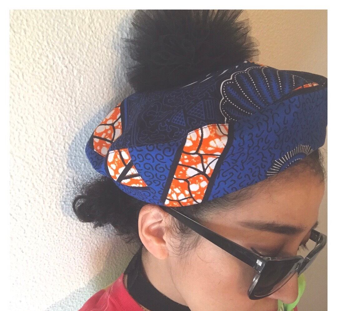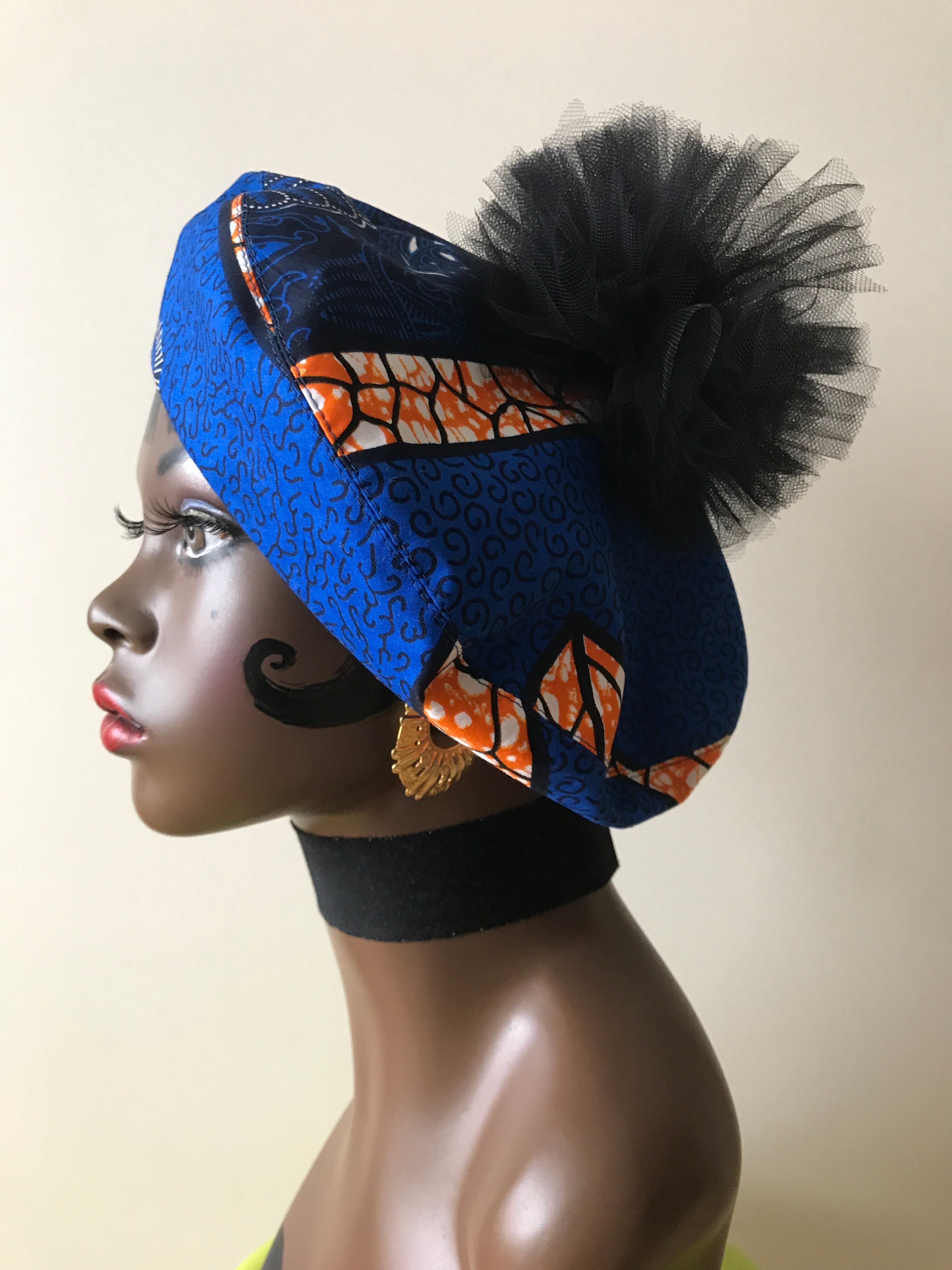 鮮やかなブルーとオレンジが顔周りをはっきりさせ てくれます。シンプルなお洋服に合わせてもいいし、アフリカンプリントに合わせてもお洒落。