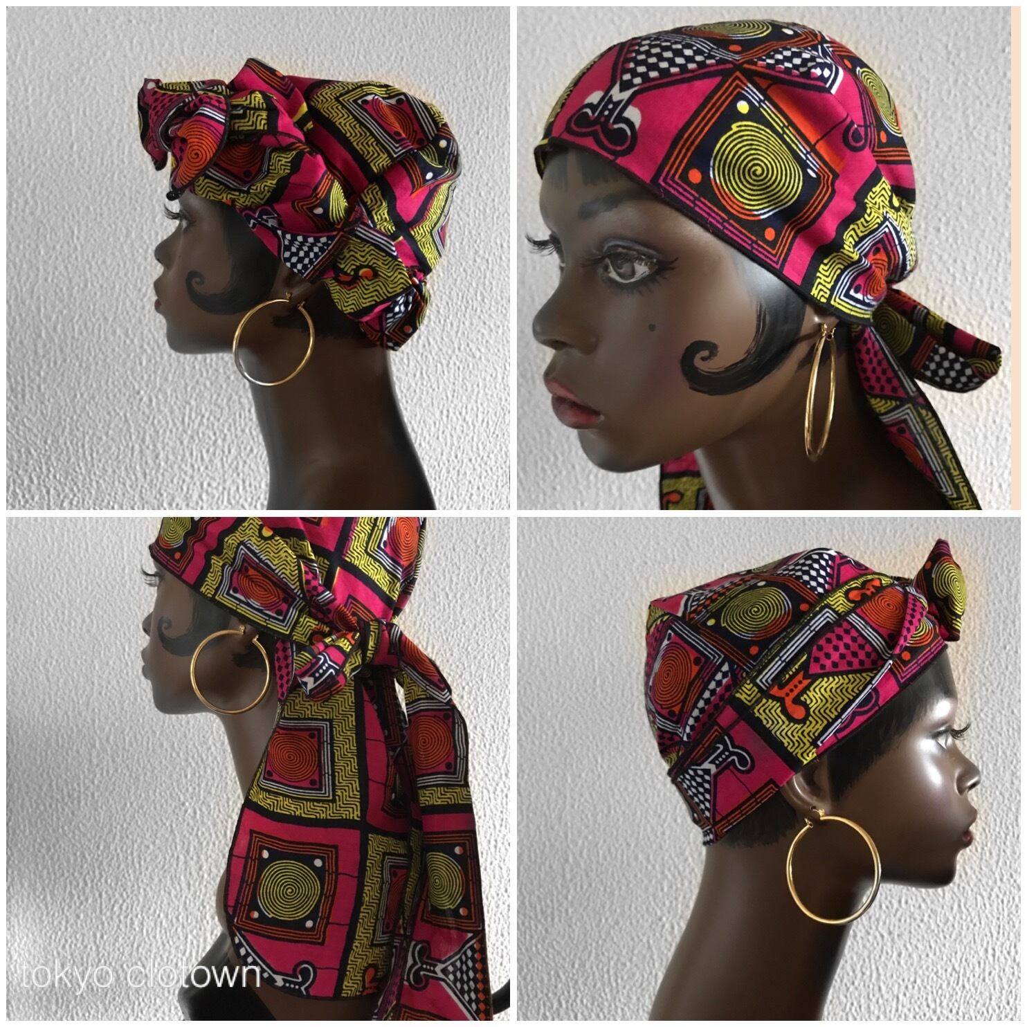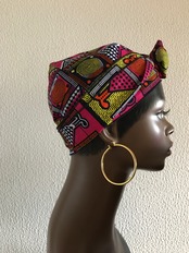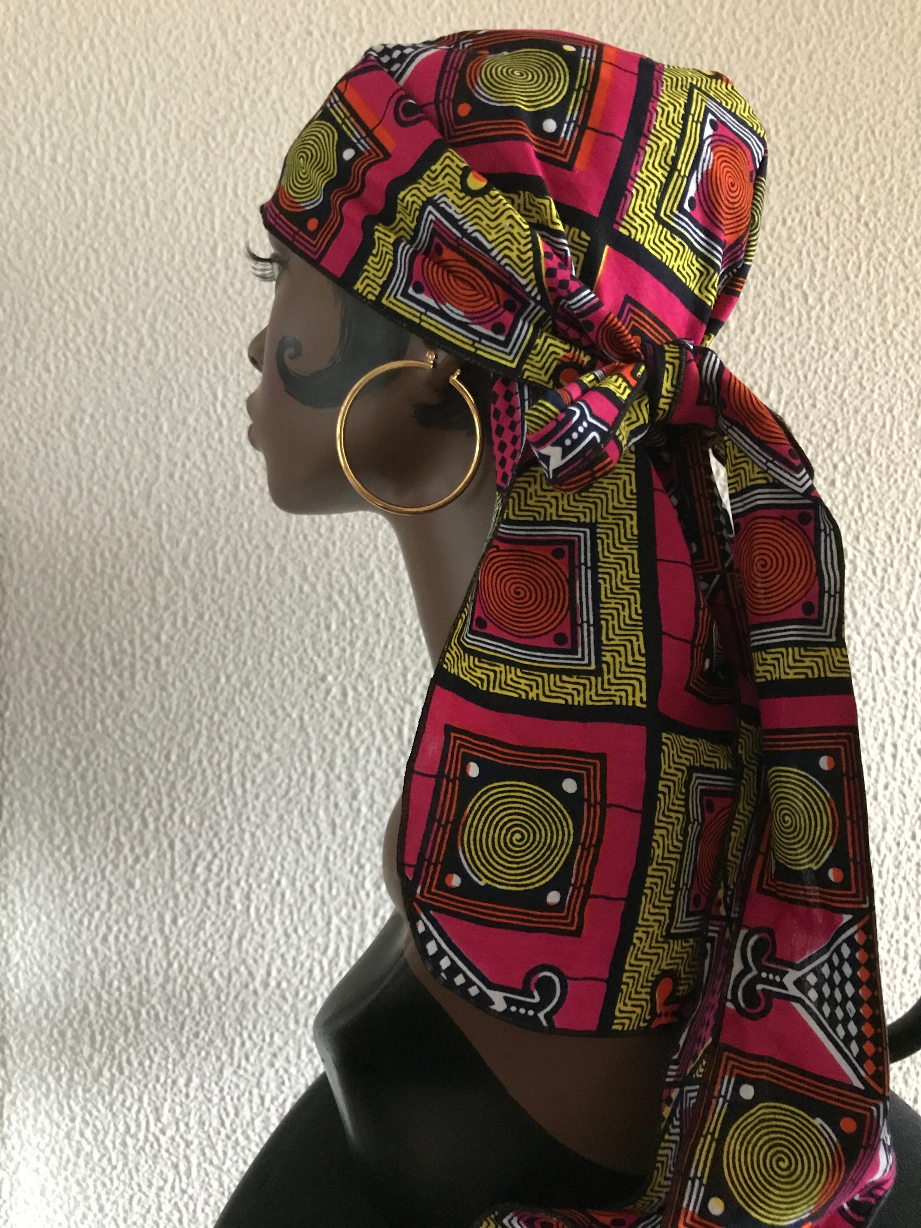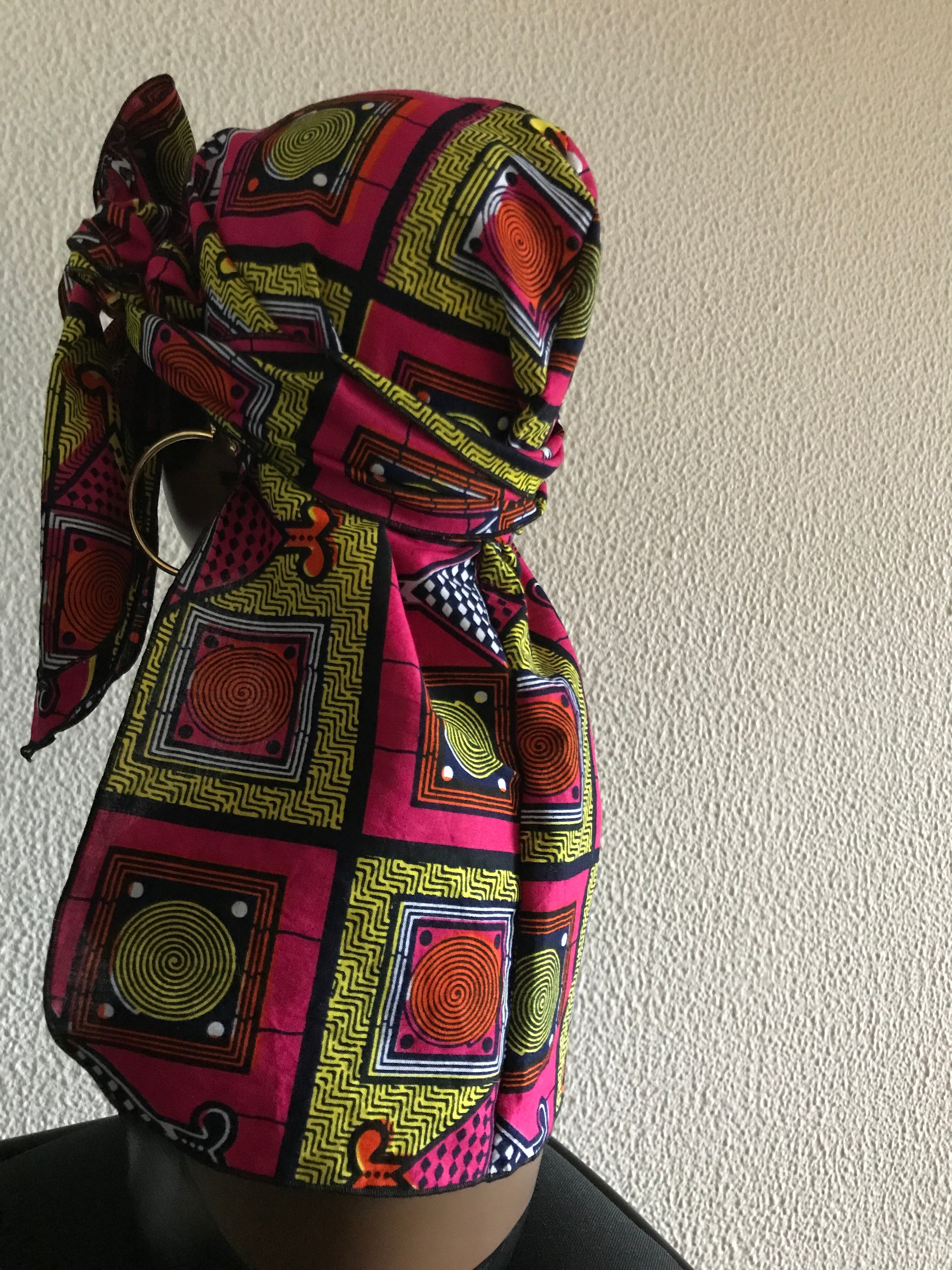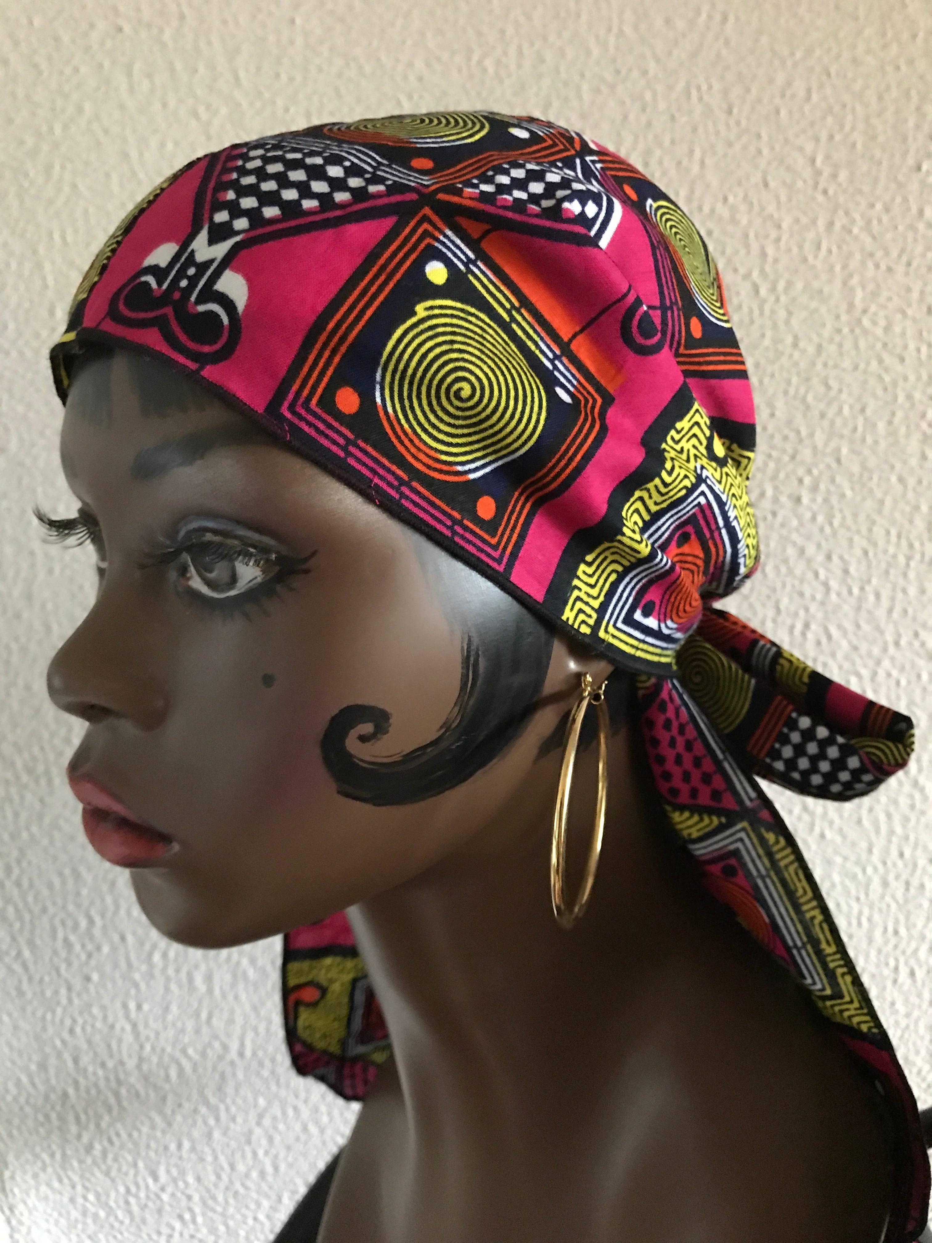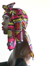定番のドゥーラグをアフリカンプリントでつくりました。